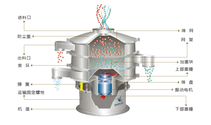 三次元旋振篩工作原理由直立式電機作激振源,電機上、下兩端安裝有偏心重錘,將電機的旋轉運動轉變為水平、垂直、傾斜的三次元運動,再把這個運動傳遞給篩面,使物料在篩面上做外擴漸開線運動,故該系列振動篩稱之為旋振動篩。旋振篩具有物料運行的軌跡長,篩面利用率高等優點,調節上、下兩端重錘的相位角,可改變物料在篩面上的運動軌跡.可以對物料進行精篩分、概率篩分等。