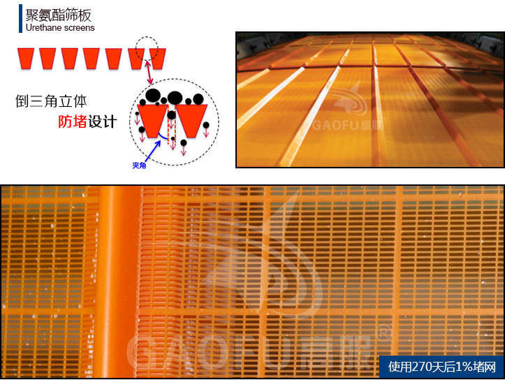 (3)篩網(wǎng)為高耐磨聚氨酯材質(zhì),篩孔尺寸可根據(jù)要求選擇;